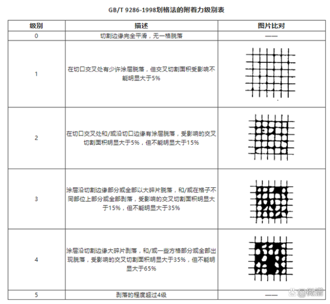 評級方法:在良好照明的環境下,目視檢查測試面涂層的脫落情況。附著力共分6個等級,從0級到5級涂層附著力依次遞減,5級最差。GB/T 9286-1998劃格法的附著力級別見下表。